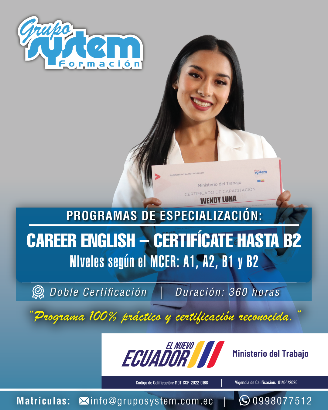 - Doble certificación: Internacional por Grupo System formación y Certificación Avalada por el Ministerio de Trabajo de Ecuador (MDT).